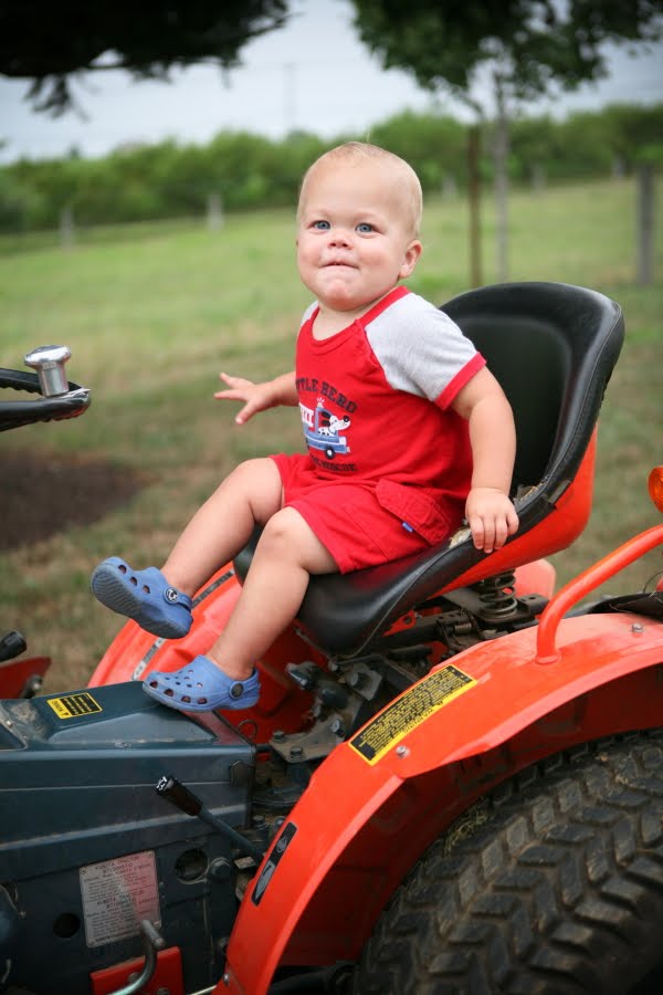 It doesn't take any convincing to get the boys to ride any kind of tractor...especially if Daddy is already on the seat. Last week, Eric decided that the very sick fire bushes (that we tried numerous times to save) had to come out. The seat was full and the job went well. We even got to examine a praying mantis up close.